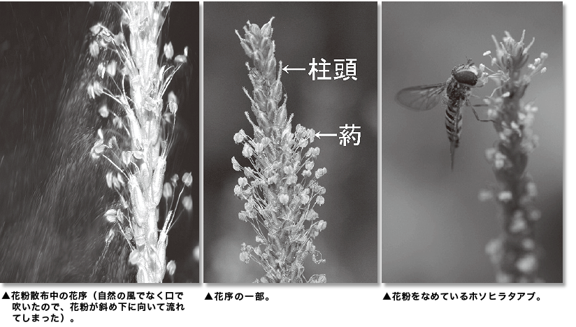 野外で見ていると、よくハナバチやハナアブの仲間が訪れている場面に出合う。花は蜜を分泌しないが、花粉は蛋白質や脂質に富んでいるので、ハナバチはそれを幼虫の餌として集め、ハナアブの仲間は自らの食料としている。そのさい、昆虫は花序の上を歩き回るので、花粉が授受されるのだ。こう見てくると、オオバコは風媒受粉のみならず虫媒受粉も兼用しているため種子を多く作れるのだ、と言えそうだ。